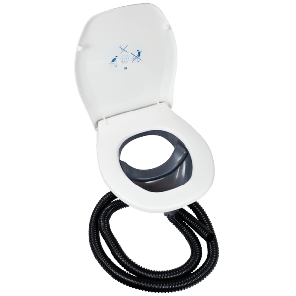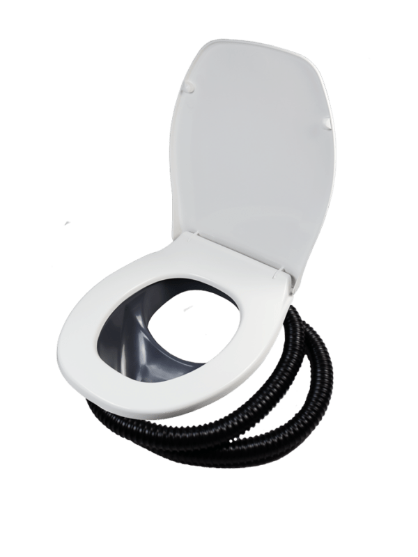 The Separett Privy kits converts your existing outhouse or latrine to a urine diverting system. This snazzy version includes a folding toilet seat! The reduction of urine from solids greatly reduces the odor and decomposition periods. The units installs on the latrine platform and the attached urine hose diverts fluids from the current holding location. Also available in blue. Warranty period is two years. The shipping box includes a template for the seat cut out. If you are considering mounting directly over a bucket it requires a 14 inch diameter top. The folding seat allows for airflow through the seat into the latrine compartment. It is best used with a fan vented latrine.
